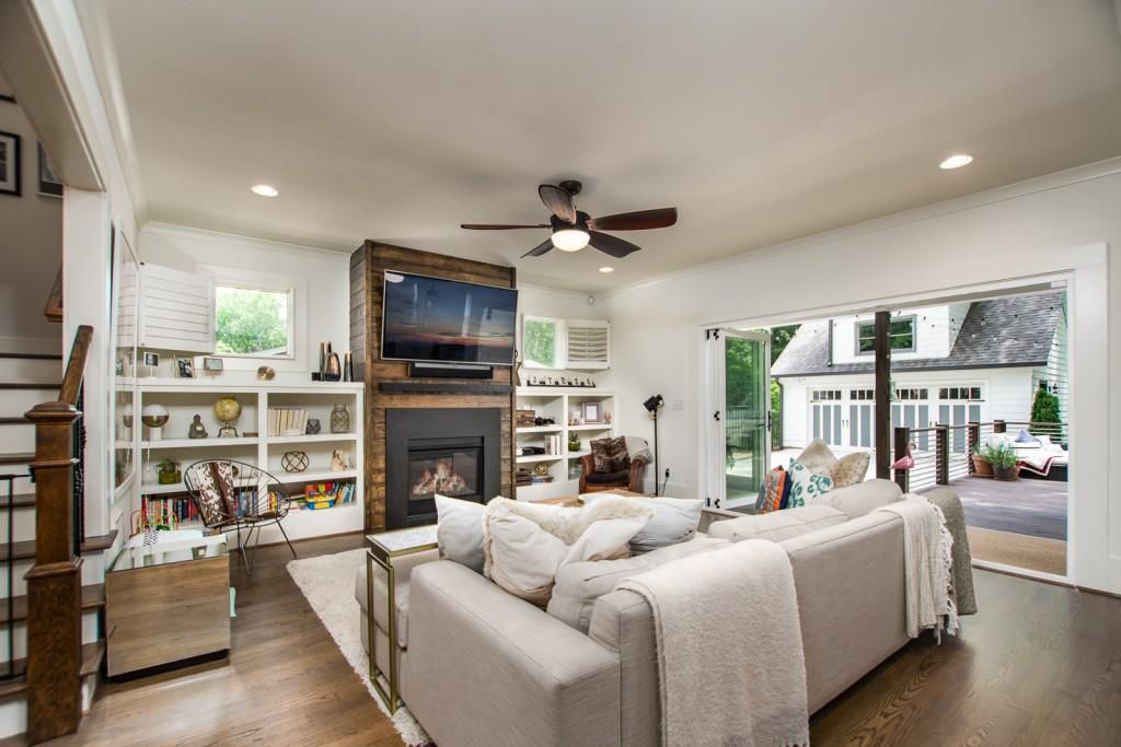Craftsman home blends timeless architectural charm with bright, open living spaces designed for comfortable everyday living. The living room flows seamlessly to the outdoor area through large sliding doors, creating a natural connection between indoor comfort and outdoor entertaining.